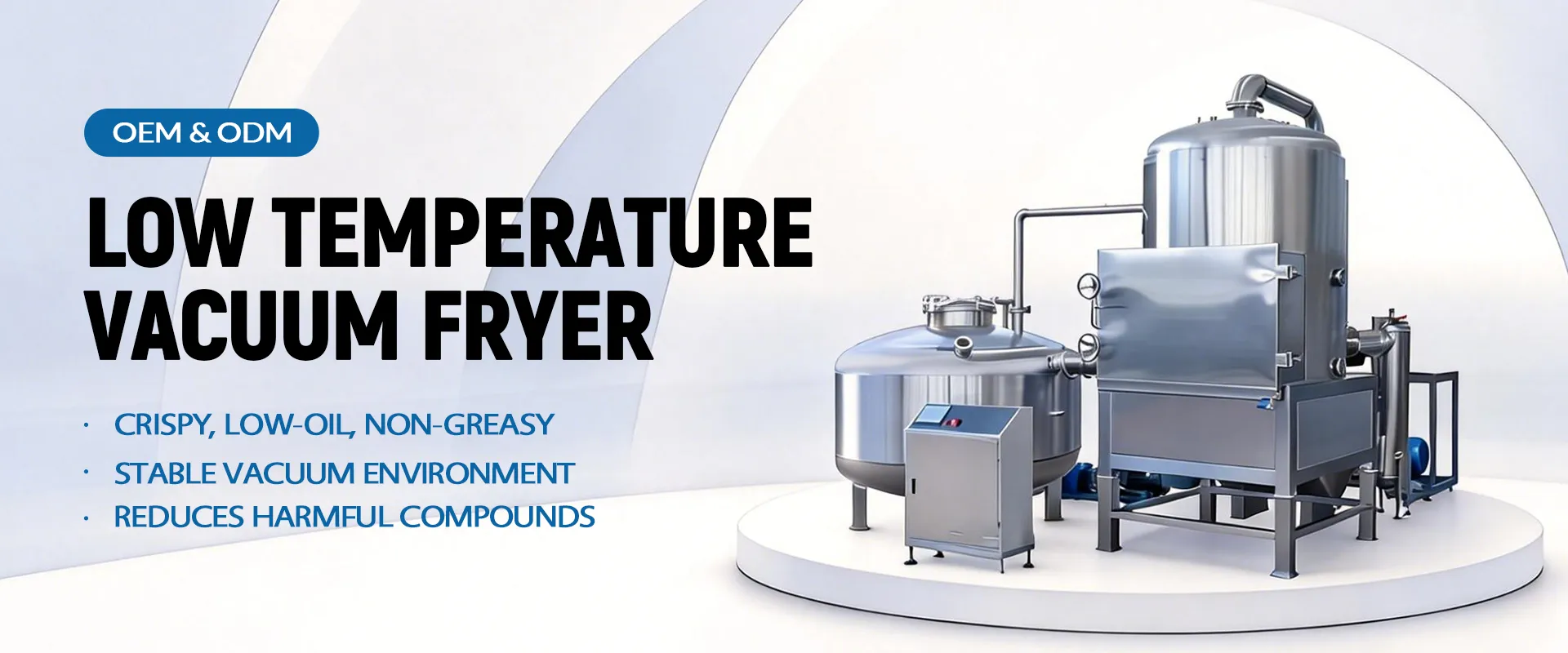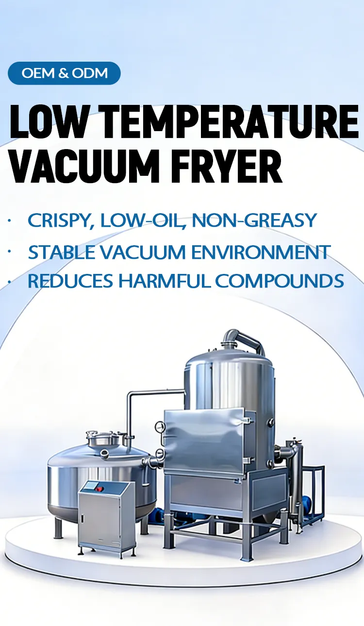 Low Temperature Vacuum Fryer The Vacuum Fryer makes crispy, healthy snacks. It keeps food's natural color and flavor with low heat and less oil. Perfect for fruits, vegetables and nuts. Save oil costs and make better snacks. Get A Quote Hot Sale Models For more different production models, please feel free to inquire. Model 80 Get A Quote Model 120 Get A Quote Technical Specifications ModelModel 80Model 120Size(mm)L3200*W3200*H3000L4000*W4000*H3300Material Container SizeDiameter 800mm, depth 450mmDiameter 1200mm, depth 600mmWeight3 tons4 tonsMaterial304 food-level stainless steelPower25KW42KWVapor Pressure0.25~0.4Mpa0.3MpaUltimate Vacuum-0.095Mpa~-0.098 Mpa(no material)Operating Temperature≤120℃70-120 ℃ (adjustable)Control SystemFull process microcomputer automatic control (automatic/manual)Oil Removal Speed0~300 revolutions per minute (adjustable)Oil Removal FormBuilt in degreasingSingle Machine Output60kg-90kg per time200kg-300kg per timeWe can customize machines with higher output according to your needs Details Air Compressor Material Container and Trolley Oil Pump Vacuum System More Healthy and Safe Than Ordinary Frying Machines Different models have different production volumes and appearances Get A Quote You May Need Continuous Fryer Get A Quote Ordinary Deep Fryer Get A Quote Online Message Please feel free to give your inquiry in the form below. Your Name*: Your Email*: Your Phone*: Your Country*: Your Whatsapp: Your Message*: * We respect your privacy and keep your personal information strictly confidential.